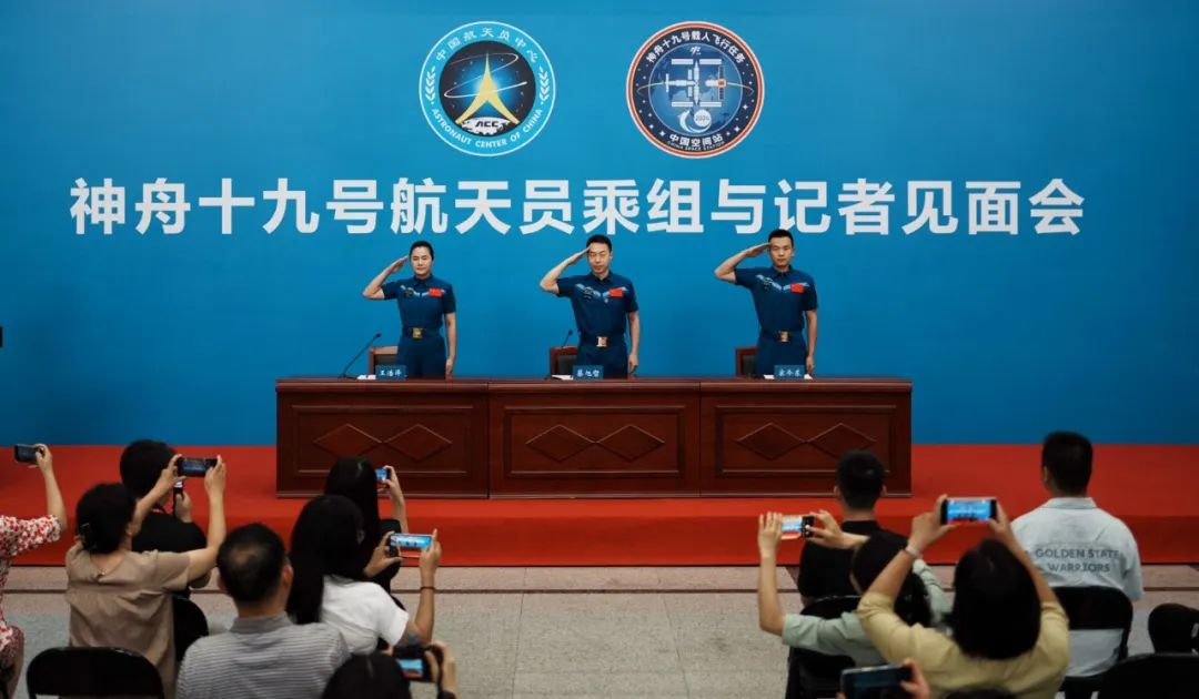 圖為神舟十九號航天員蔡旭哲(中)、宋令東(右)、王浩澤(左)在記者見面會上敬禮致意。
